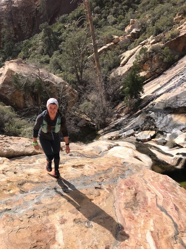 By mile 2.2 you should be following the bouldery creek bed. This is where the fun really begins. You will encounter big rocks to scramble up and slabby slickrock waterfalls. There are cairns here and there that let you know you are going in the correct general direction, but don’t rely on them exclusively because they may lead you astray. (For example: DO NOT follow the cairns up the boulder field on the right side of the canyon around mile 3.5). Your best course of action is to stick to the creek bed, or as close to it as possible, and keep going upstream.
